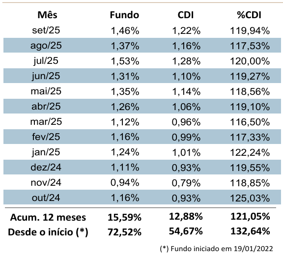 Pela alocação em cotas de fundos de investimentos de crédito privado, promovendo diversificação de carteiras, baixa volatilidade e zelando pelo patrimônio investido por nossos cotistas.