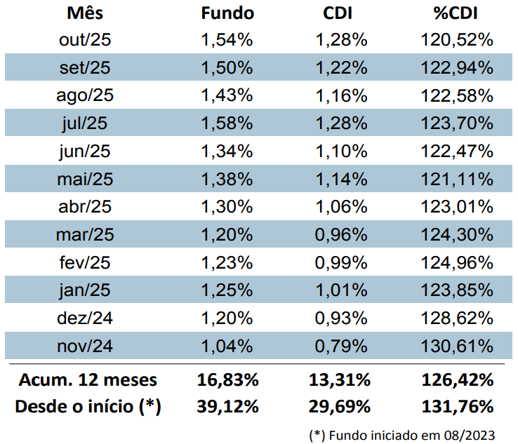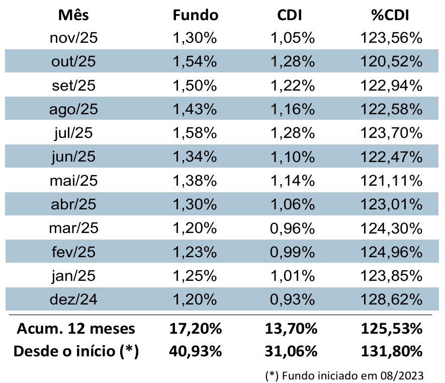 Pela alocação em cotas de fundos de investimentos de crédito privado, promovendo diversificação de carteiras, baixa volatilidade e zelando pelo patrimônio investido por nossos cotistas.