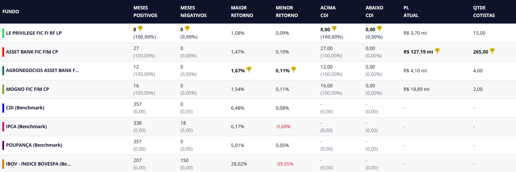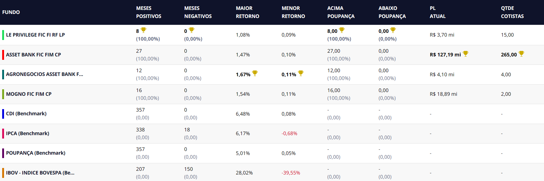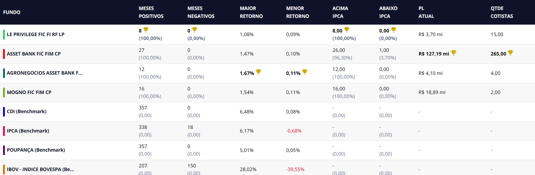 É um conjunto de métricas que avaliam o desempenho dos fundos de investimento da Azumi ao longo do tempo. Ele fornece informações sobre a frequência de meses positivos e negativos, indicando períodos de valorização e desvalorização. Além disso, destaca o maior e o menor retorno mensal de cada fundo, oferecendo insights sobre sua volatilidade. O “Patrimônio Líquido Atual” representa o valor total dos ativos do fundo no momento atual, enquanto a “Quantidade de Cotistas” indica o número de investidores que possuem aplicações no fundo. Essas métricas combinadas proporcionam uma visão abrangente do histórico do fundo, permitindo avaliar sua consistência e volatilidade ao longo do tempo.